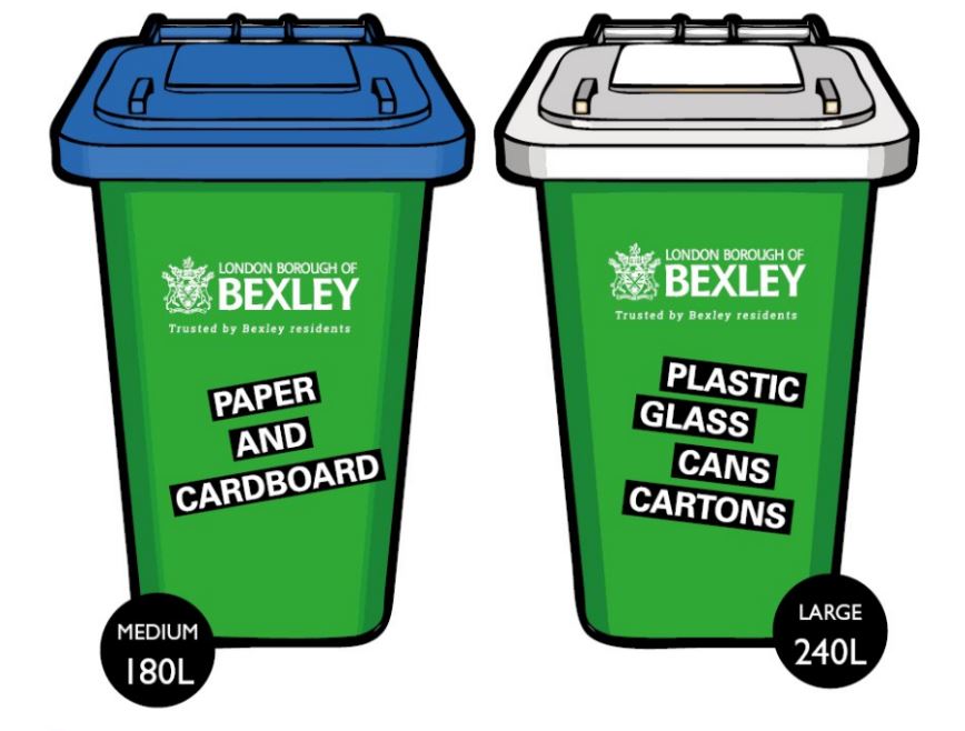 From November, residents will get a blue lidded bin for paper and cardboard and a white lidded bin for plastics, glass, cans and cartons. Delivering all the new bins will take up to 14 weeks. You will be able to find out when you will receive your new bins from the end of October at www.bexley.gov.uk/recycling-changes